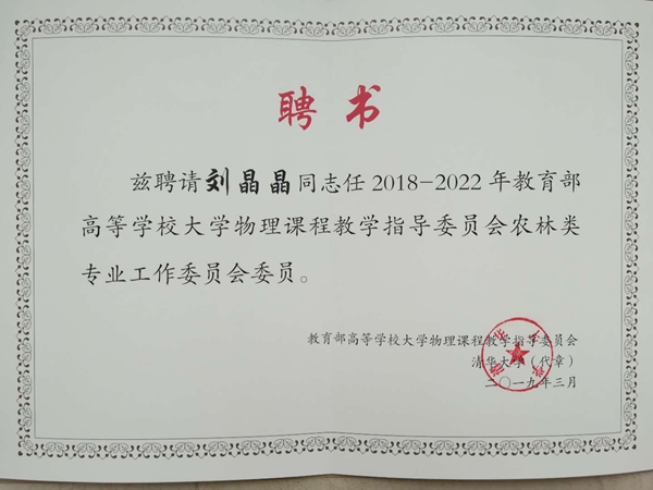 刘晶晶教授入选教育部大学物理课程教学指导委员会(农林类)委员
