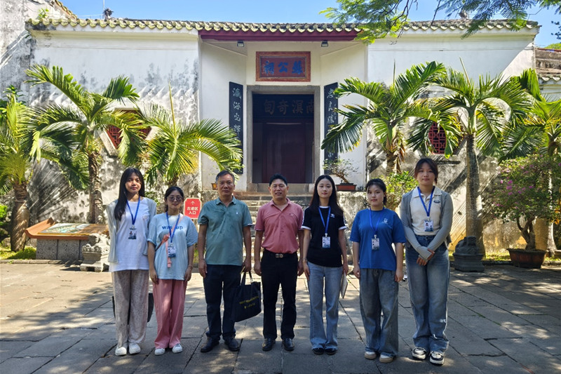 灰瓦白墙的苏公祠坐落在五公祠内,大门外有几棵避火蕉,沿着台阶拾级而上,大门两旁嵌着一副楹联“忠良胜迹存正气,瀛海光辉启文明”。炎炎夏日,我们beat365官方网站“东坡文化保护宣传实践队”一行人步入了这座承载着深厚文化底蕴与历史沧桑的庭院。指导老师符聪副教授邀请了海南省作家协会副主席、海南省苏学研究会常务副秘书长彭桐,为我们讲解了苏东坡在海南的趣事。