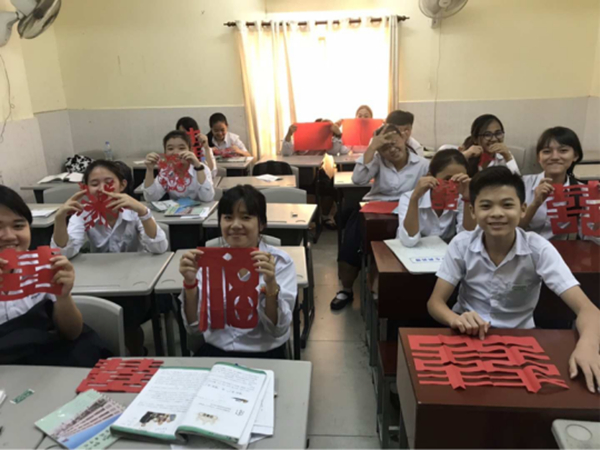中国文化也是作为汉语教师的一个教学项目之一。教学过程中,我发现学生内在力量不足,学习缺乏主动性,容易丧失信心。因此,我的课程设计更加偏向于明确学习目标,多鼓励他们开口练习口语,这样才能让学生感受到中华文化的魅力,发现华文学习的乐趣与好处,学习才有后劲。所以这一年里,我主要利用一周一次的周会组织专门的文化活动,上课时结合课文内容穿插文化教学,并将节日风俗和课文内容多次结合起来,举办文化活动。如元宵节制作灯笼,中秋节讲述“嫦娥奔月”故事,结合华文教材“中国年”和“柬新年”开展“中柬文化对比活动”,学习丝绸之路一课时给学生播放“丝绸之路”纪录片、讲解普及“一带一路”的知识等。中柬建交六十周年也是一个很好的学习契机,我组织班级学生开展了“中柬建交六十周年”主题班会和演讲比赛,让他们牢记中柬可贵友谊。辩论赛等活动也相继开展,在思维的碰撞中学生汉语的表达能力得到了强化,合作精神也得到了锻炼。学生们都以极大的热情投入到活动中,堪称效果显著,惊喜连连。