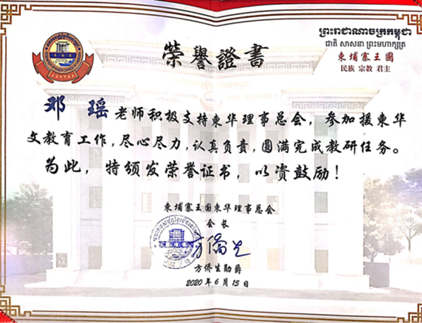 邓瑶获柬埔寨柬华理事总会荣誉证书