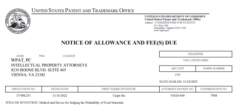 近日,胡亚芹教授领衔的科研团队在食品3D打印领域取得重大突破,其研发的Method and device for judging the printability of food materials(一种评判食品物料可打印性的方法及装置)正式获得美国专利商标局(USPTO)授权通知(美国专利号:US 17/988,251)。这是学校在食品智能制造与增材制造交叉领域获得的又一项重要国际性知识产权成果,标志着beat365官网相关技术的创新性获得了国际认可。