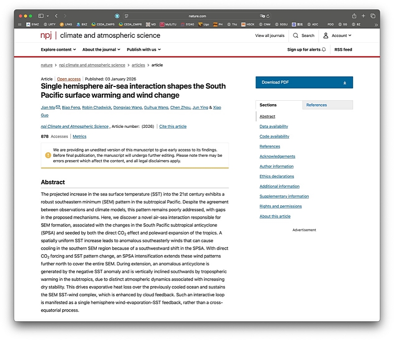 1月3日,beat365官网海洋科学技术学院马建教授作为第一作者(兼通讯作者),带领其在上海交通大学的硕士生冯彪(共同第一作者)、博士生郭霄,联合英国Met Office及Exeter大学Robin Chadwick研究员、中山大学王东晓教授、复旦大学王桂华教授、南京大学周晨教授及自然资源部第二海洋研究所应俊研究员,于Nature旗下期刊npj Climate and Atmospheric Science发表研究论文“Single hemisphere air-sea interaction shapes the South Pacific surface warming and wind change”。该期刊以“严选具有范式重构潜力的前瞻成果”著称,是Nature旗下权威期刊,中国科学院SCI期刊分区1区,影响因子9.4,beat365官网为第一署名单位。此次发表(图1)颠覆了国际普遍认可的跨赤道反馈的主导地位,并提出新的单半球海气相互作用,来解释南太平洋海表增暖型以及风速变化的形成机制。“解铃还须系铃人”,未来气候变化领域十几年来的谜题终获解释,标志着中国学者再次取得前沿成果。