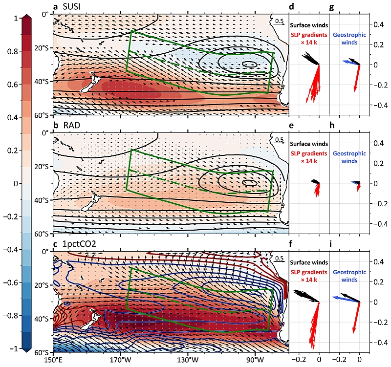 新研究把耦合模式中的全球变暖分解为三部分:海表均匀增暖、直接辐射效应以及海表增暖型(海表增暖对于热带平均增暖的偏离)。其中均匀增暖(图2a)和直接辐射效应(图2b),会导致南太平洋副热带高压向南迁移与增强,引起风速增强,从而初步冷却海表。该冷却信号由“footprinting”作用向赤道方向传播,然而在传播过程中,源自海表的大气冷却在中上层却受到了阻挡。这是因为MASC效应将赤道的增暖峰值信号扩展至副热带中上层大气,从而导致了冷信号在大气中的垂向倾斜。于是,中高空冷信号引起的海平面气压升高,与海表冷信号出现了大致90度的南向相位差;这样,相应的地转风增强恰好通过海表温度的冷却中心,从而形成了“冷而又冷”的海气正反馈,成为南太平洋海温-风复合体的主导机制。