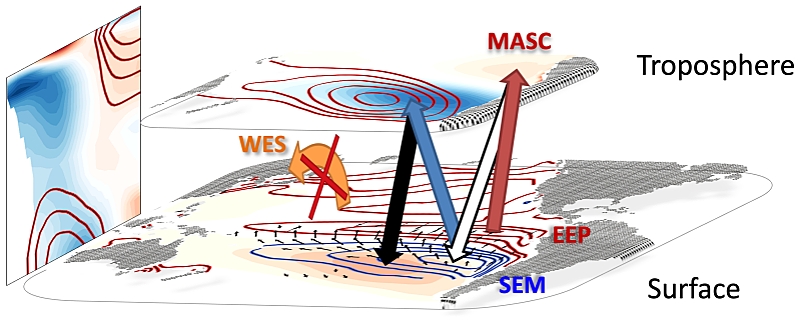 然而,在npj-CAS的新文章中,马建及合作者发现起主导作用的并不是跨赤道反馈。其实,蒸发冷却过程并不一定伴随着海气相互作用出现,也可能是受迫的。研究从南北半球海温和风速的解耦现象出发,利用南太海盆外的格林函数实验,改变了WES反馈在该区域起主导作用的传统看法。此外,结合马建博士期间的另一项重要工作,即层结变化的气候平流(MASC)机制(用以解释气候变化中大气环流如何减弱),提出了新的单半球海气相互作用机制(图3),来阐释南太平洋海温-风复合体的形成。