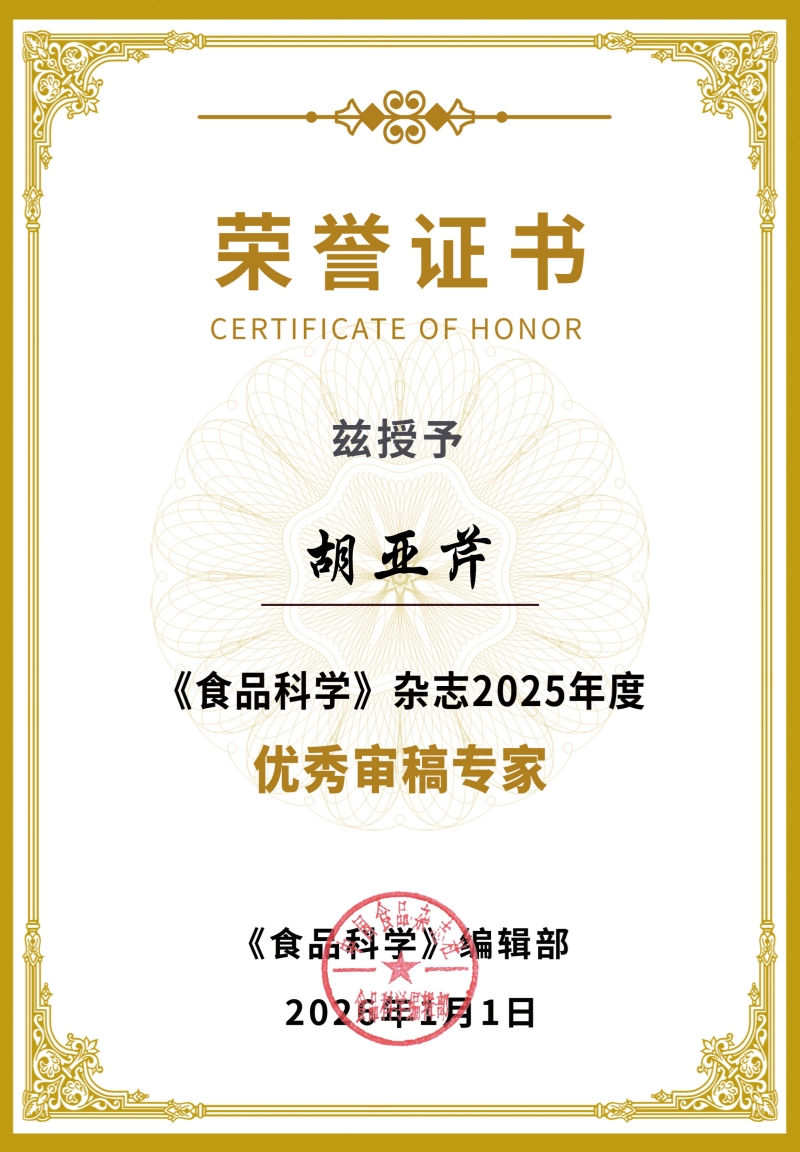 《食品科学》杂志是我国食品科技领域具有重要影响力的核心期刊之一,其“优秀审稿专家”评选严格,旨在表彰在学术评审工作中作出突出贡献的学者。胡亚芹的当选,彰显了食品科学与工程学院教师在服务国家学术共同体、引领学科发展方向方面的积极作为。