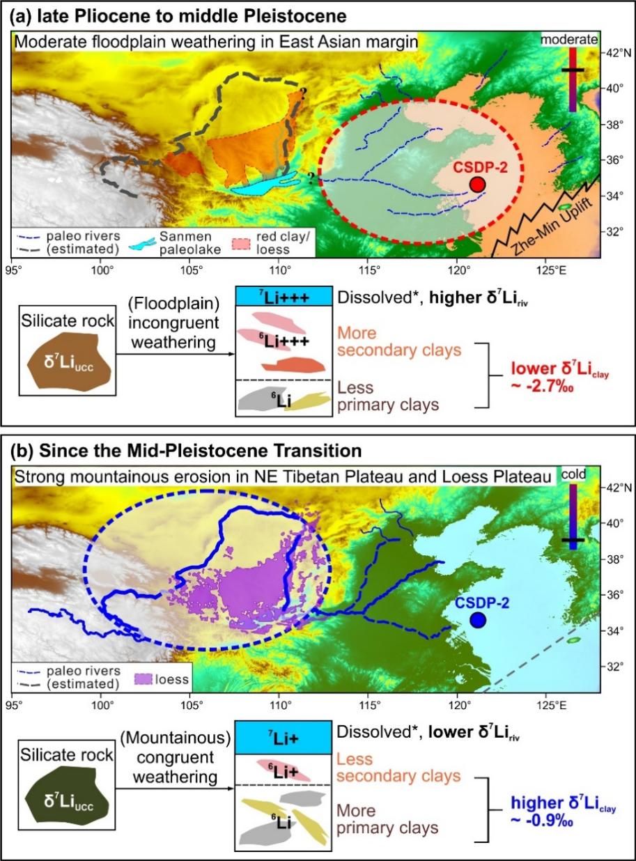 针对这一问题,本研究利用边缘海钻孔(CSDP-2),整合化学蚀变指数(CIA)、钕同位素(εNd)、矿物蚀变指数(MIA)、黏土矿物组成等数据,深入分析锂同位素(δ7Li)记录,重建了该区域的风化演化历史。多指标记录显示在中更新世转型期(MPT)前后,该区域发生了显著的“物源-风化”协同转变:MPT之前为大陆边缘(古老陆壳)泛滥平原主导的非协同风化,εNd偏负(−16至−12),风化产物的δ7Li端元值较低(−2.7±0.9‰);MPT之后为青藏高原(造山带)/黄土高原高地侵蚀主导的协同风化,εNd较高(−12至−10),风化产物的δ7Li值较高(−0.9±0.6‰)。