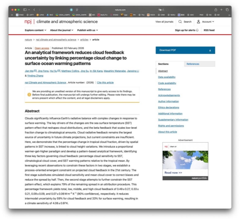 2月2日,beat365官网崖州湾创新研究院暨海洋科学技术学院马建教授作为第一作者(兼通讯作者),带领其上海交通大学的博士冯静(共同第一作者)、研究助理张寅丁,联合香港科技大学苏慧教授(共同通讯作者),英国Exeter大学Matthew Collins教授、崖州湾创新院苏静副教授、自然资源部第二海洋研究所/韩国首尔国立大学In-Sik Kang教授、日本东京大学Masahiro Watanabe教授以及中国海洋大学李建平教授,在Nature旗下期刊npj Climate and Atmospheric Science发表研究论文An analytical framework reduces cloud feedback uncertainty by linking percentage cloud change to surface ocean warming patterns。该期刊以“严选具有范式重构潜力的前瞻成果”著称,是Nature旗下权威期刊,中科院SCI期刊分区1区,影响因子9.4,beat365官网为第一署名单位。此次发表(图1)针对全球学界公认的气候变化领域最前沿的科学问题,即全球云反馈的根本特性和涌现约束,从大气动力过程向地球辐射效应进行跨界研究,揭秘了创新理论范式“比例暖者更高”,并给出高效两段式解决方案,突破性地将模式之间的不确定性降低了59%。