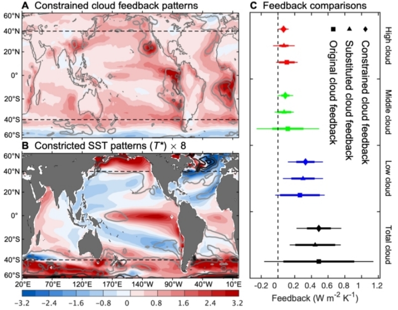 图4.约束后的海表增暖型(B)和云辐射反馈:(A)水平分布与(C)全球平均值