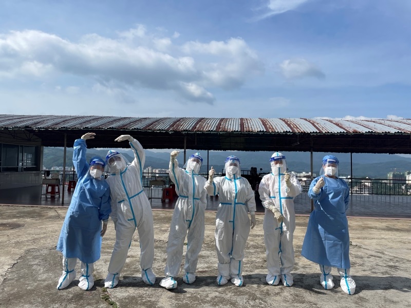 五指山校区最缺的就是年轻教师,为了协助校医进行高效的核酸检测工作,辅导员们穿上防护服、隔离衣,变身大白、小蓝,义无反顾地冲到防疫第一线。在实施网格化管理期间的五次核酸检测中,担任信息采集和核酸采样工作。