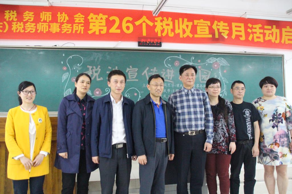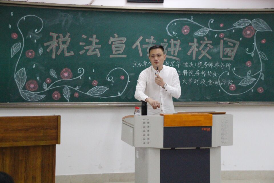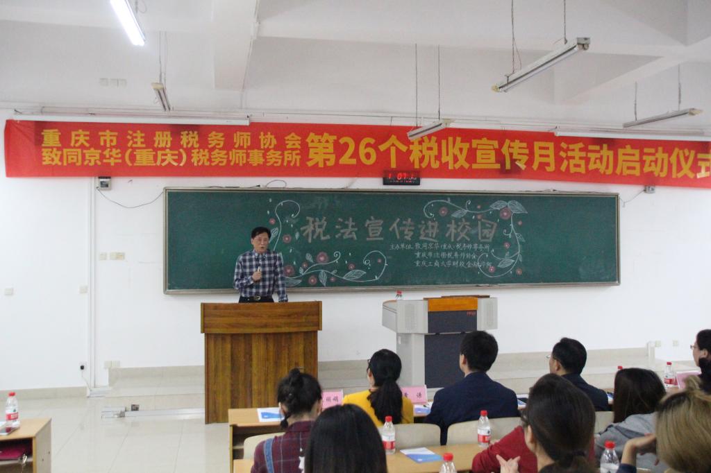 5月5日下午,由致同京华(重庆)税务师事务所、重庆市注册税务师协会、财政KY开元集团官网联办的2017税法宣传进校园活动在南岸校区博智楼212教室成功举办。重庆市注册税务师协会副会长陈光信、重庆市注册税务师管理中心副主任王洪宇、KY开元集团官网财政KY开元集团官网党委副书记黄谦、致同京华(重庆)税务师事务所首席合伙人白云燕、注册税务师管理中心副处调研员徐勇、财政KY开元集团官网财税系主任尚可文、致同京华(重庆)税务师事务所副总经理陈怡、财政KY开元集团官网学团办主任兰丽娟出席了本次活动。