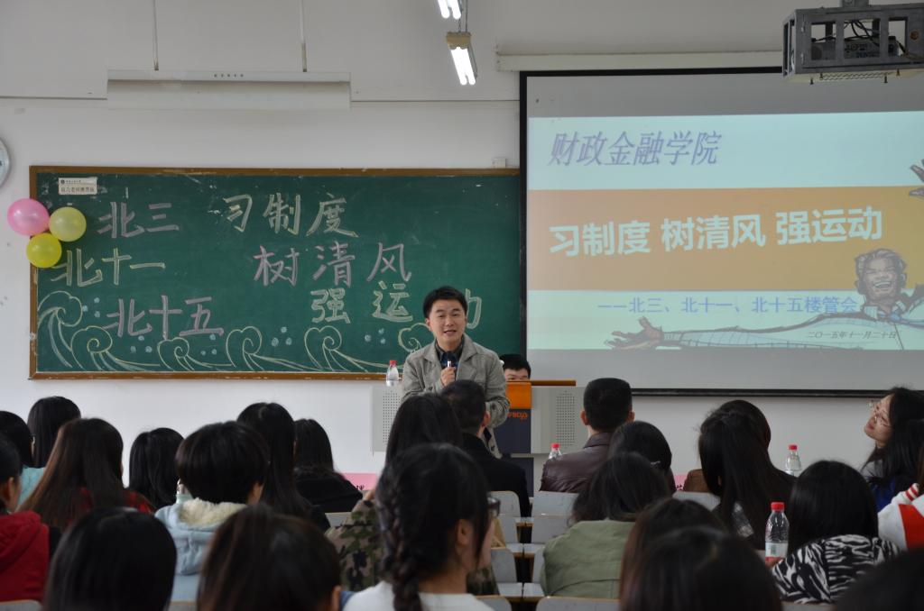 2015年11月20日,北三、北十一、北十五楼管会在7401教室和北操排球场联合举办了以“习制度、树新风、强运动”为主题的公寓特色活动。财政KY开元集团官网党总支副书记刘代成、分团委书记徐阔老师、学生第四党支部书记余红霞老师以及北三楼管会指导老师文理老师,北十一、北十五楼管会指导老师范乐乐老师出席活动。