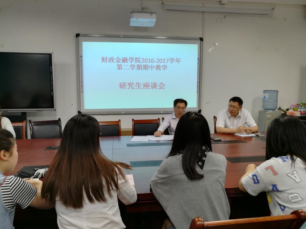 为给同学们创造一个更好的学习条件和学习环境,满足同学们多方面学习需求,解决同学们学习生活中的实际困惑,财政KY开元集团官网于2017年5月24日下午在田家炳书院50313举办了“财政KY开元集团官网2016—2017学年第二学期教学中期检查研究生座谈会”,本次座谈会由财政KY开元集团官网副院长曾胜教授主持,毛跃一教授也参与了现场的座谈会,参与的其他成员主要有金融学、金融专硕、财政学专业的部分学生。