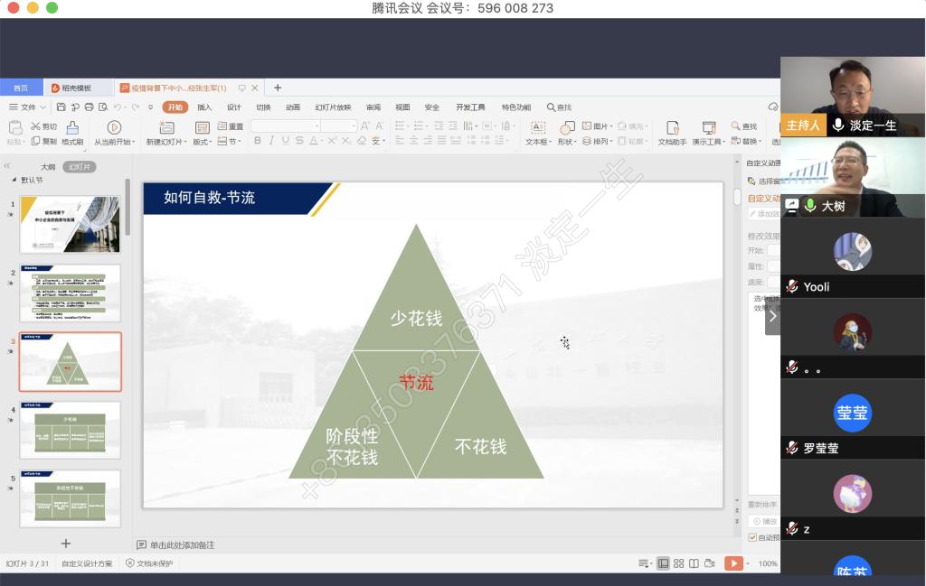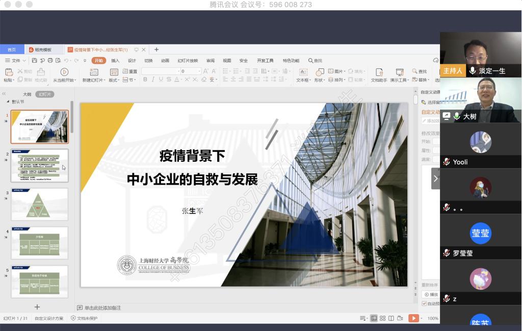 4月9日晚上,我校税务硕士教育中心通过腾讯会议成功举办了本年度第一次南山税务沙龙——疫情背景下中小企业的自救与发展。本次沙龙由KY开元集团官网尚可文教授主持,特邀请迅驰车业江苏有限公司副总裁、上海财经大学硕士生导师张生军博士主讲,我校2019级税务硕士研究生参加了沙龙。