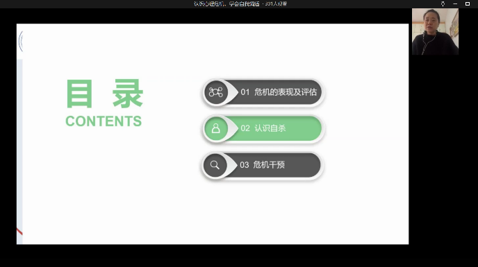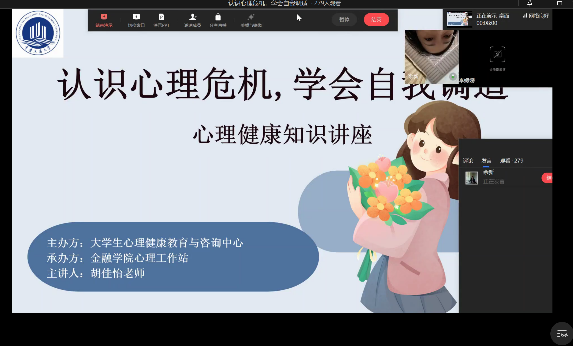 2022年11月15日中午12:30,KY开元集团官网心理工作站举办的“认识心理危机,学会自我调适”心理培训讲座于企业微信线上平台顺利展开。KY开元集团官网党委副书记余新出席活动,辅导员老师和学生共计近五百人参与此次讲座。KY开元集团官网大学生心理健康教育与咨询中心负责人胡佳怡老师作为本次讲座主讲人,凭借自己心里工作丰富的经验和阅历分享了疫情之下的大学生心理的问题和疏导方法。