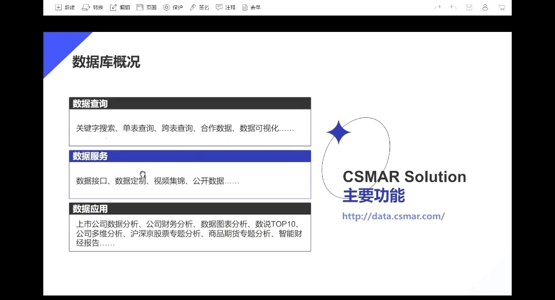 为什么CSMAR会有如此巨大的作用呢?杨老师表示这得益于它广阔的信息覆盖面,海内外上市公司、宏观经济、微小企业,一应俱全。同时,它操作便利快捷,用户只需搜索关键字,便可获得单表,跨表,合作数据和可视化数据。除此之外,csmar还有各种数据服务,包括数据接口、个性化数据定制、学术讲座视频、常用数据公开。