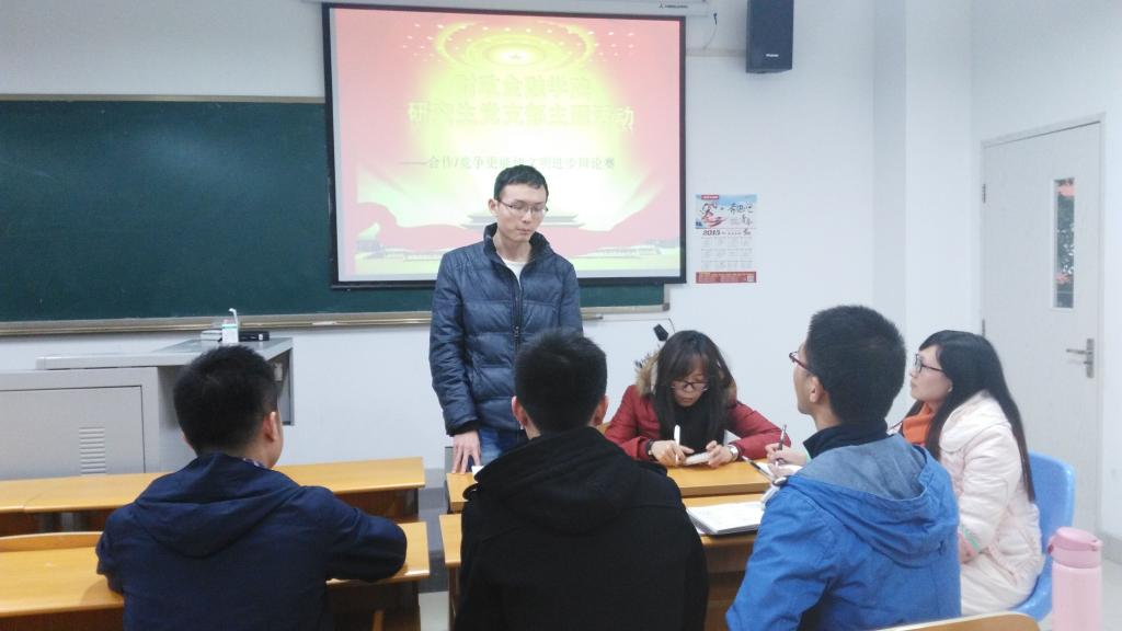 本着交流第一,比赛第二的原则,所有同志分为两组,分别就各组的辩题发表了自己的观点。梅华秋和黄晓认为合作更能使文明进步,王右右、王善义和吴昊认为竞争更能使文明进步。梅华秋认为科技是通过合作发展的,就像马克思说的那样:社会是人与人关系的总和。黄晓提出“三个臭皮匠,顶个诸葛亮”,来说明大家合作起来才能更好的发挥集体的力量。作为反方,王右右和王善义都认为毛泽东思想、邓小平理论和中国特色社会主义理论的提出,就是希望中国能够增强国际竞争力,才能在复杂的国际形势中占有一席之地。吴昊通过国际与国内竞争的例子对比以及阐述古往今来竞争带来的好处来证明反方的观点。针对这一辩题,大家都提出了自己的看法,进行了思维的共享和交流,这个过程既有竞争也有合作。