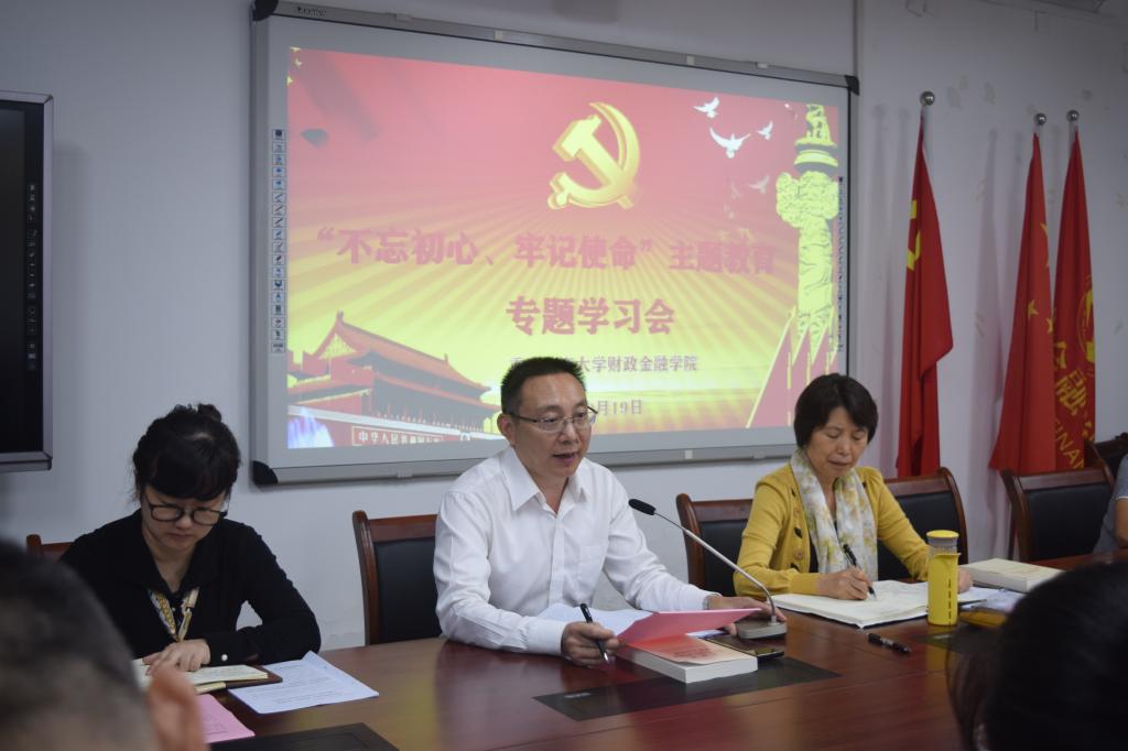 按照校党委“不忘初心、牢记使命”主题教育工作安排,9月19日,财政KY开元集团官网召开了“不忘初心、牢记使命”主题教育专题学习会暨第一次集中学习研讨会。校 “不忘初心、牢记使命”主题教育巡回指导二组副组长、校党委宣传部部长华杰同志亲临会议现场进行监督指导,学院领导班子全体成员、各支部书记参加了会议。会议由院党委书记杨萍同志主持。