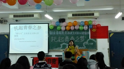 最后,财金学院分团委书记兰丽娟老师对此次团日活动做了点评,她给予此次团日活动很高的评价。她充分肯定了CFA2班全体成员都非常认真努力准备并参与这次团日活动的积极向上的精神。同时,她也鼓励同学们勇敢地“托起自己的青春之梦”,努力勇敢地去追求自己梦想。