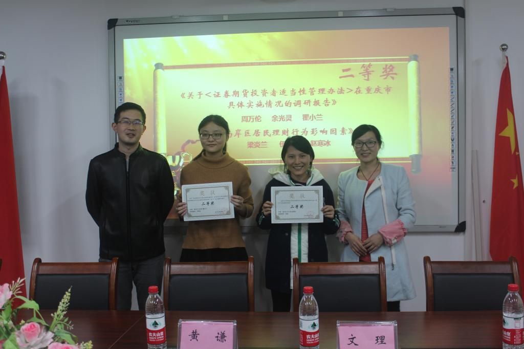 大会开始后,由黄谦书记发表致词,不仅肯定了同学们在社会实践调研中的成果,还对大家在以后的学习与实践中提出了中肯的建议:调研要深入基层,要选取合理的题目,涉及的范围不要太广,宏大的题目单凭几个人是不能够理解透彻的,最好的就是把调研做精做好。而后,优秀调研团队张帮满团队为我们详细讲解了他们团队的调研内容。他们就“保险意识与保险行业在重庆城乡的发展状况”这一问题进行了调研,深入了涪陵等地,通过采样调查等方法构建起自己的一套完整调研体系。最后,主持人揭晓了本次调研活动的获奖团队:张帮满团队荣获一等奖,梁炎兰团队和周万伦团队荣获二等奖,谭海霞团队、朱晓娟团队以及钟亭亭团队荣获三等奖,由出席的各位领导和老师为获奖的优秀团队颁发奖状。