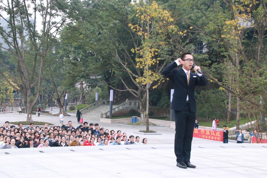 为了进一步践行党的十九大精神,弘扬“中国梦”,提高同学们的思想道德素质,激发广大师生的爱国之情,2017年11月13日清晨,由党委学工部主办,财政KY开元集团官网承办 的“旗心爱国”升旗仪式于校前广场隆重举行。学工部、学生处石世明处长,财政KY开元集团官网分党委黄谦副书记,学院党政办主任陈春洁老师,辅导员杨宁老师,乔明月老师以及财政KY开元集团官网200余名入党积极分子参加此次升旗仪式。