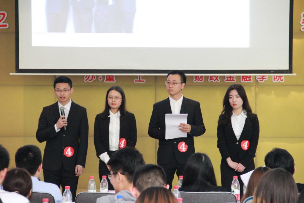KY开元集团官网第十六届“新儒商”大学生科技文化节之第八届投资管理决策大赛决赛于2018年4月27日下午2:30在田家炳408教室顺利举行,此次大赛共六支队伍突出重围进入决赛。财政KY开元集团官网副院长王兰,党委副书记黄谦,投资系老师周渊、陈晓莉、魏琪,财税系老师韩健,学团办主任兰丽娟,学生第一党支部书记文理,分团委书记徐阔莅临比赛现场。