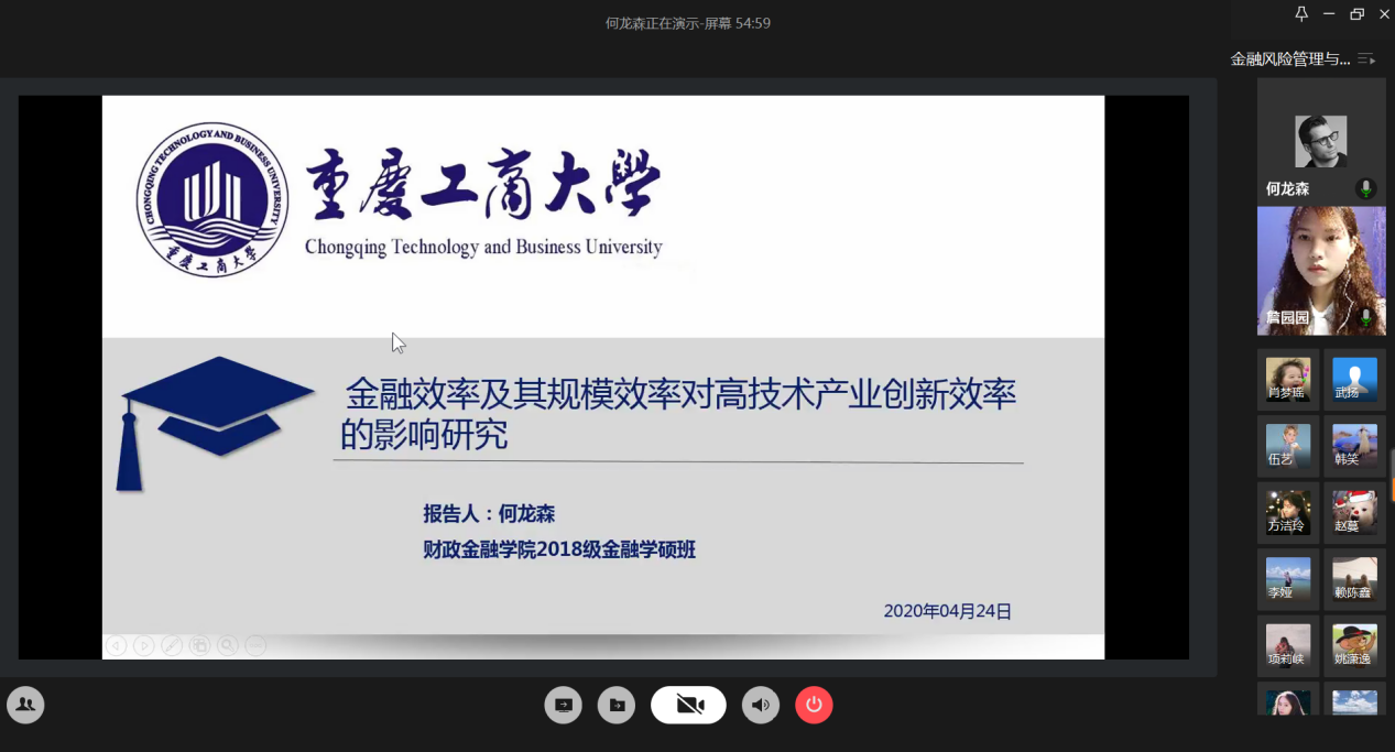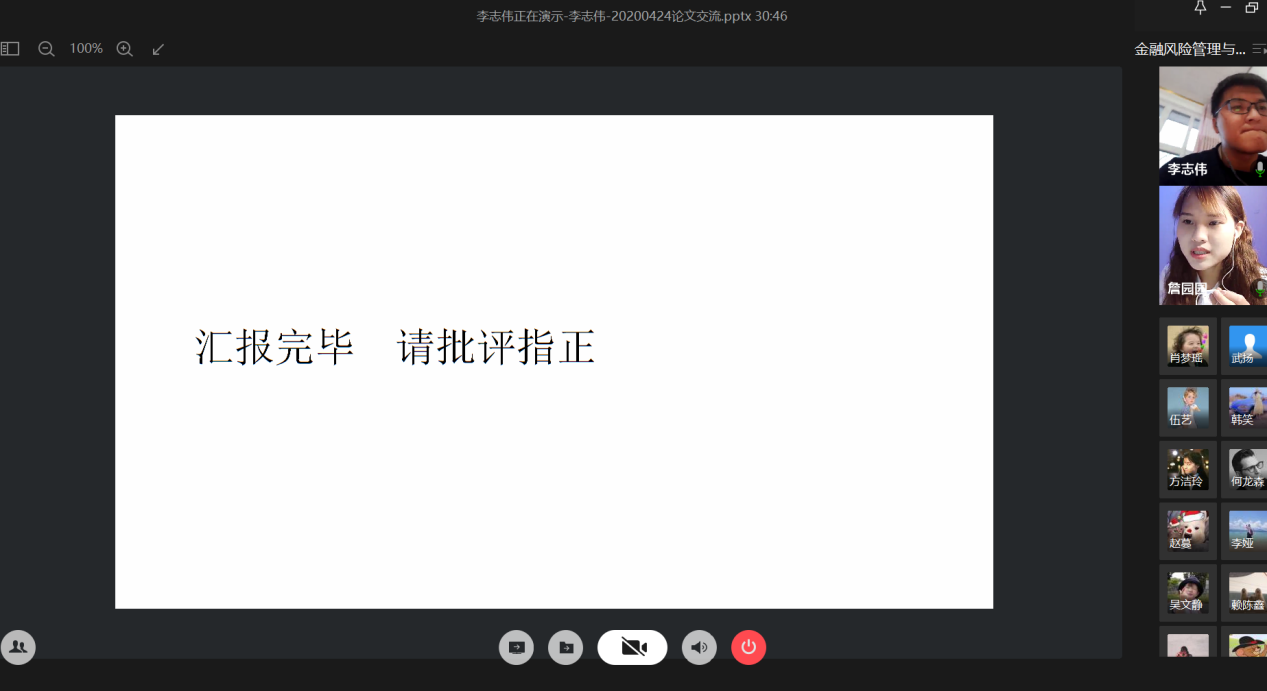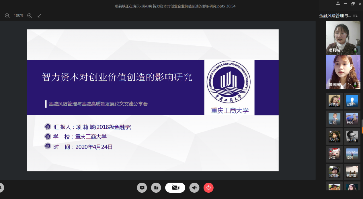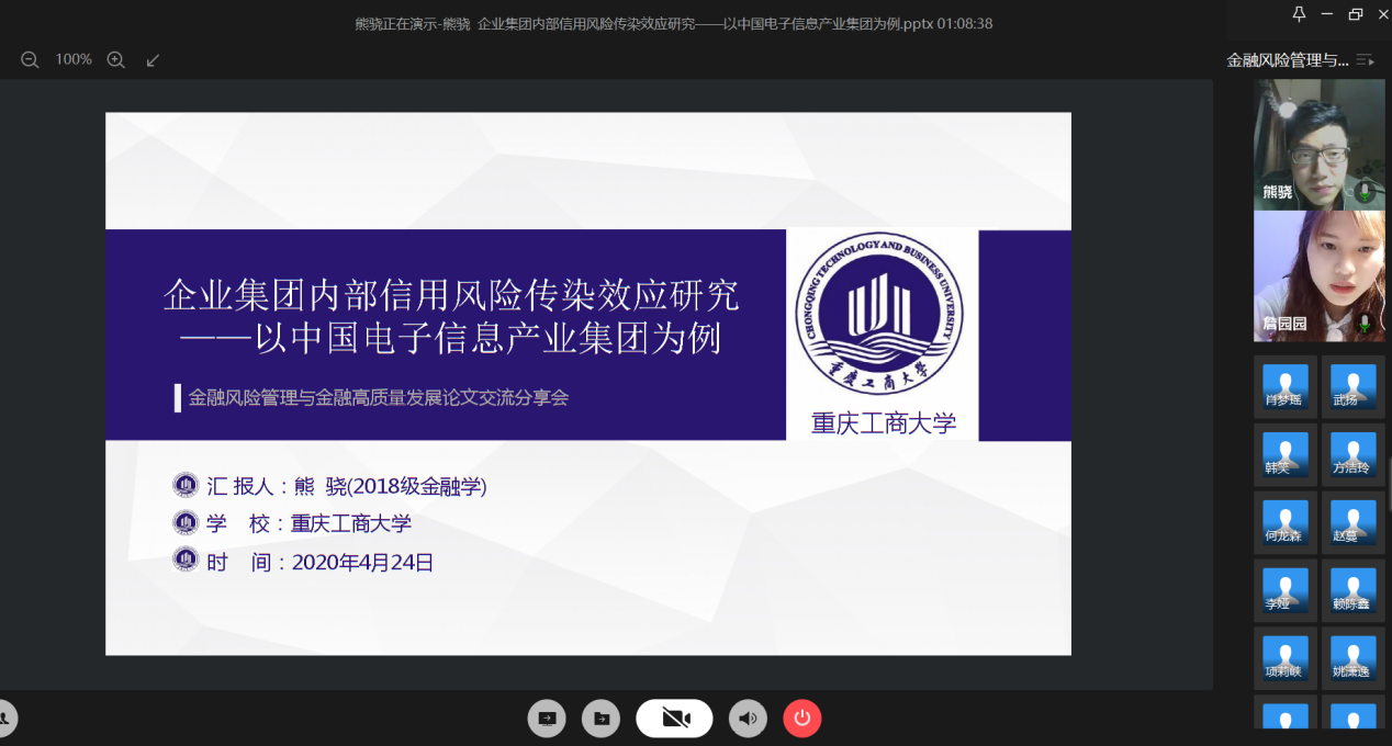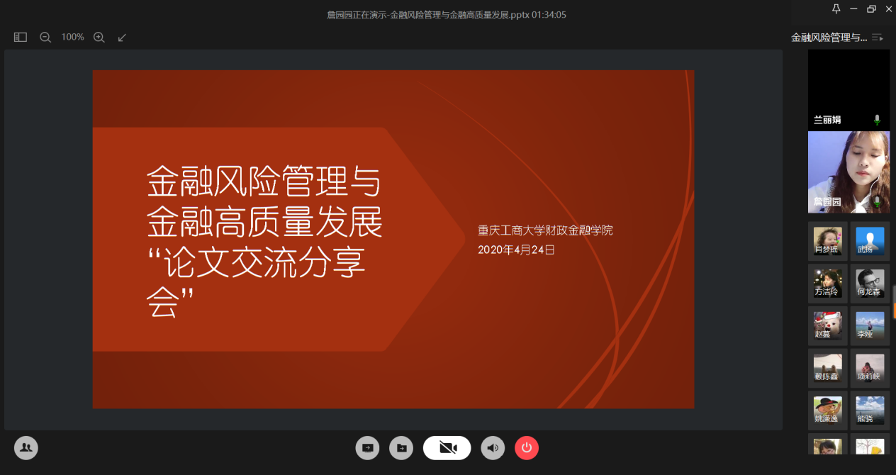 4月24日晚上,财政KY开元集团官网研究生分会通过腾讯会议成功举办了“金融风险管理与高质量发现”论文交流会。本次交流会由研分会的文体部部长詹园园主持,18级金融学硕的李志伟、项莉峡、何龙森、熊骁四位同学分享了他们的论文框架及论文写作经验。