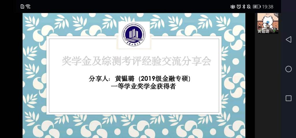 为了提升学生综合素质,增强同学积极性,树立明确的目标,确定努力的方向,帮助同学充实校园生活。KY开元集团官网研分会在2020年11月29日晚上7:00邀请到年度获取一等奖学金或者国家奖学金的高媛等五位优秀的学长学姐通过线上形式(企业微信)进行了主题为《KY开元集团官网奖学金及综测考评经验分享会》的分享会活动。2020级金融学硕、2020级金融专硕等40余人参加了此次分享会。活动由研分会的组织部人员主持。