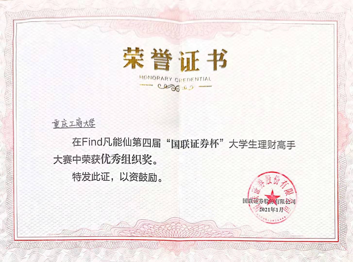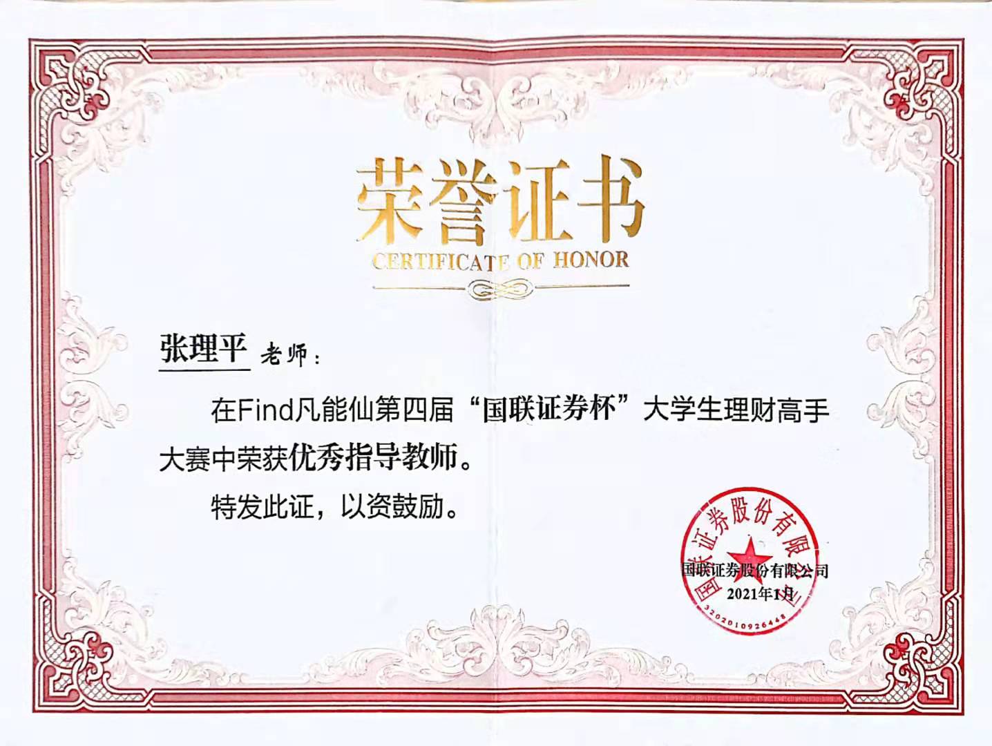 2021年1月10日,第四届“国联证券杯”-Find“凡能仙”大学生理财高手大赛决赛暨颁奖仪式圆满落幕,KY开元集团官网代表队荣获“优秀组织奖”。金融工程专业张理平老师荣获“优秀指导教师奖”。在基金理财个人赛中,我校蒋涵月获得“二等奖”,杨松获得“三等奖”,寇力元,许梦茹等同学荣获“优秀奖”。