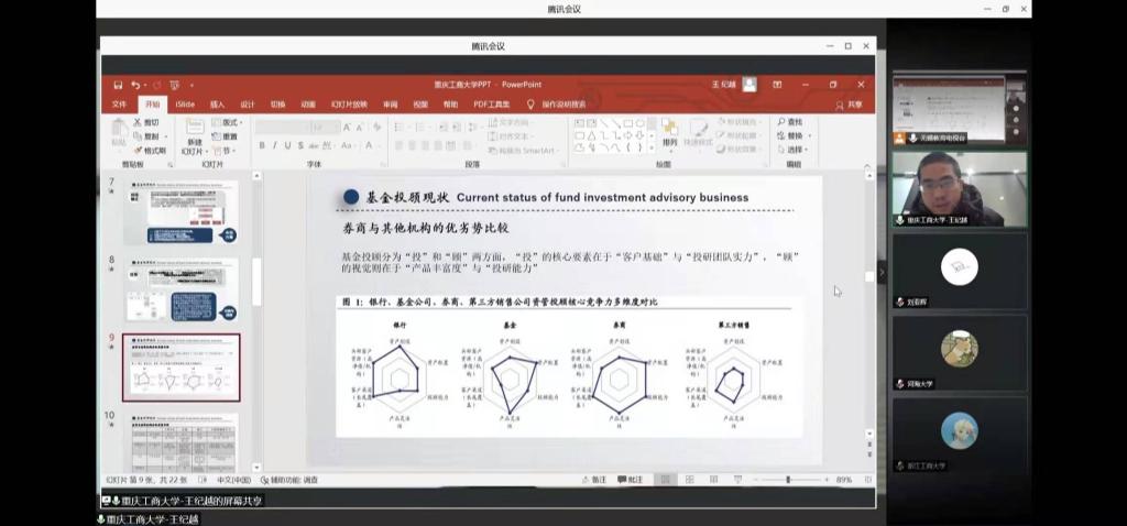 比赛中各团队进行了激烈的角逐,对于所有参赛学子来说,这不仅是一场线上直播体验,更是一场思维碰撞。决赛分为课题汇报及问答两个环节,每个代表队推选一至两名同学作为发言人,以PPT的形式对所选课题的成果进行汇报,并回答评审团提问。KY开元集团官网的参赛选手在这个舞台上,传达他们独特的投资理念;讲解金融行业动态以及未来趋势;呈现业界、学界多维度思维分析的能力;展现出工商学子蓬勃的求知欲和巨大的可能性!