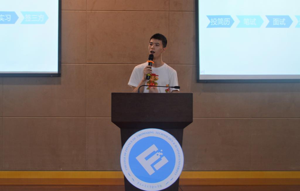 首先,杨名路主要从保险行业进行经验分享,分为两个部分,第一部分以“海王”为题展开讲解自己的求职经历,讲述他梦碎巴南税务局时,转变成“海王”广撒网,投递多份简历。当同时得到多家公司邀请时,仔细斟酌,把握好自己对工作的需求。第二部分讲解求职干货,包括求职流程,如何写简历,以及参加面试时注意事项,他以幽默的语言让同学们对如何求职有了明确的了解。然后,卿琦官从银行、证券公司和保险公司三个方面向同学们讲述了每个行业的特点以及面试不同行业的注意事项,内容广泛而富有实践价值。最后进入提问环节,参会同学积极提问,两位同学认真解答,解决了他们关于就业的疑惑,气氛达到了高潮。