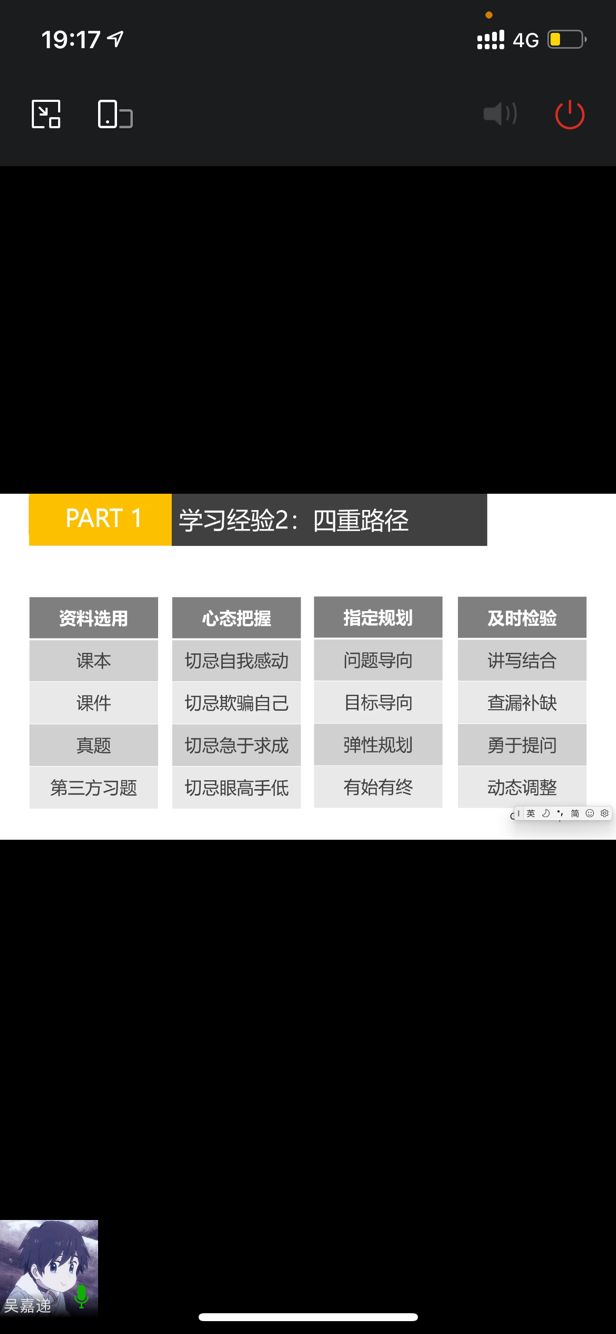 吴嘉递就大学经历所作的四个方面进行分析。他提出了课程类型认知、课程框架认知、课程方法认知、课程目的认知的“四层认知”和资料选用、心态把握、指定规划、及时检验的“四重路径”的两大学习方法,并以具体的例子提高同学们对这两个方法的理解与记忆。接着,他就大学考试备考作了经验分享,他认为备考分为看,理,刷,记四项环节,还强调了刷真题的重要性。而后,他就参加比赛,考证,研究,任职方面进行讲解,为同学们提供了获取奖学金的几条途径。最后他强调了学习合理,合理学习的重要性,提出“学习绝非可耻之事,不必东躲西藏;自律也绝非禁欲灭理,不必过分苛责。”