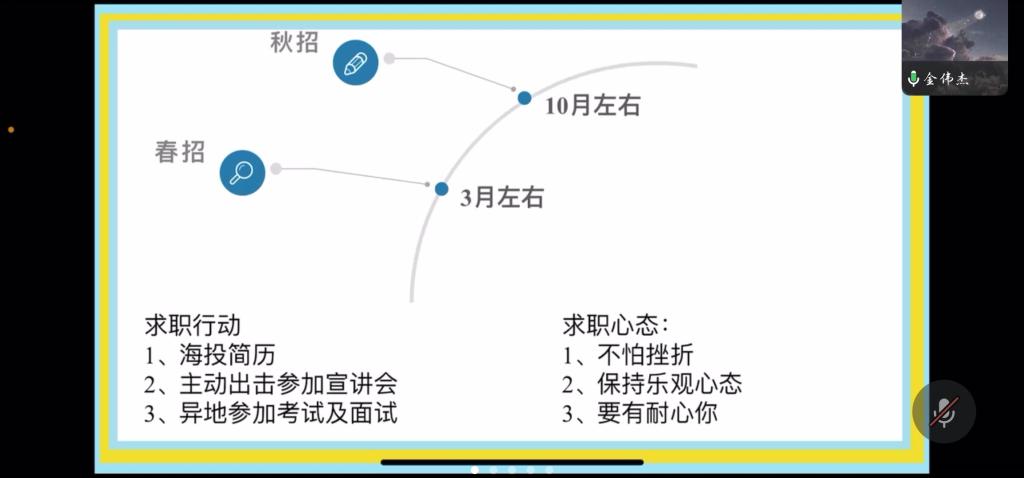 金伟杰从个人感悟、银行求职、个人建议三方面进行就业经验分享。他谈到,本科求职要关注秋招和春招的时间,做好自身规划,定好目标,同时以自身银行求职经历展开讲解,并简单介绍了部分的求职加分项。他表示,求职之路贵在坚持,同学们要海投简历,主动参加宣讲会,不怕挫折,保持乐观心态。