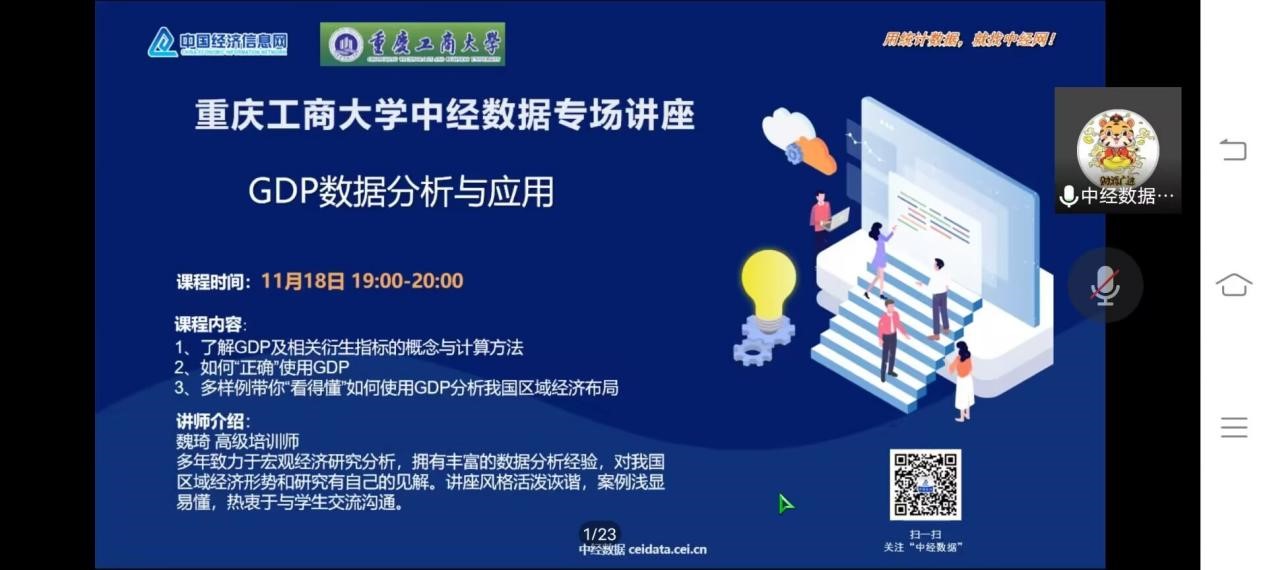 2022年11月18日19:00,KY开元集团官网联合图书馆在线上开展“GDP数据分析与应用——助你‘看得懂’我国区域经济布局”专题讲座。本次讲座邀请了中国经济信息网张玥老师和魏琦老师主讲,旨在介绍GDP数据分析与应用,带领同学们了解GDP及相关衍生指标的概念及计算方法。