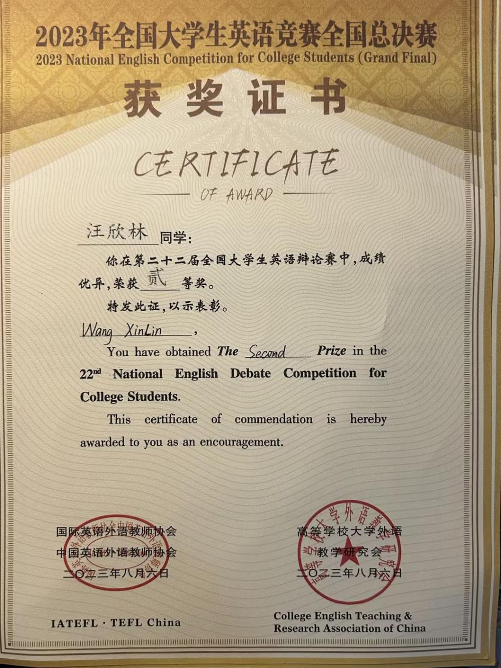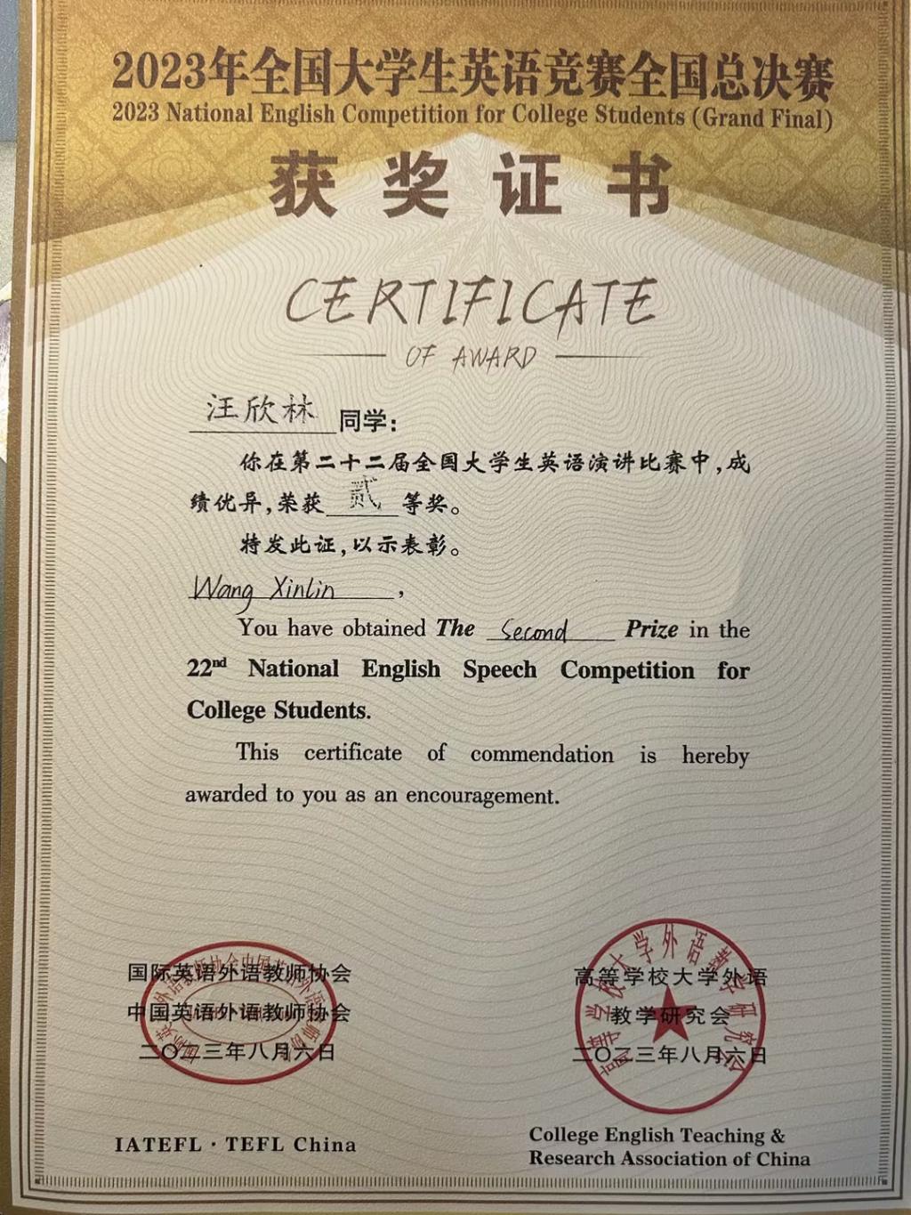 2023年8月3日下午14时,第二十二届全国大学生英语演讲比赛预赛开赛!全体参赛选手按照参赛类别分为11个分赛场进行参赛。参赛选手可在组委会上午公布的英语演讲备选题目中任选其一进行3分钟的英文演讲,演讲完毕由专家评委提问打分得出成绩。8月4日上午,第二十二届全国大学生英语演讲比赛决赛拉开帷幕,来自全国各高校的120名入围选手分成两个会场,按照抽签顺序提前5分钟抽签获得演讲题目,并上台进行3分钟即兴英语演讲,演讲题目丰富多彩,选手们妙语连珠。最终汪欣林同学荣获二等奖。