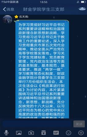 本次活动采用线上交流的方式进行,分别由石天雨和余光灵两位同志主持,参加活动有财金学生三支部全体同志。