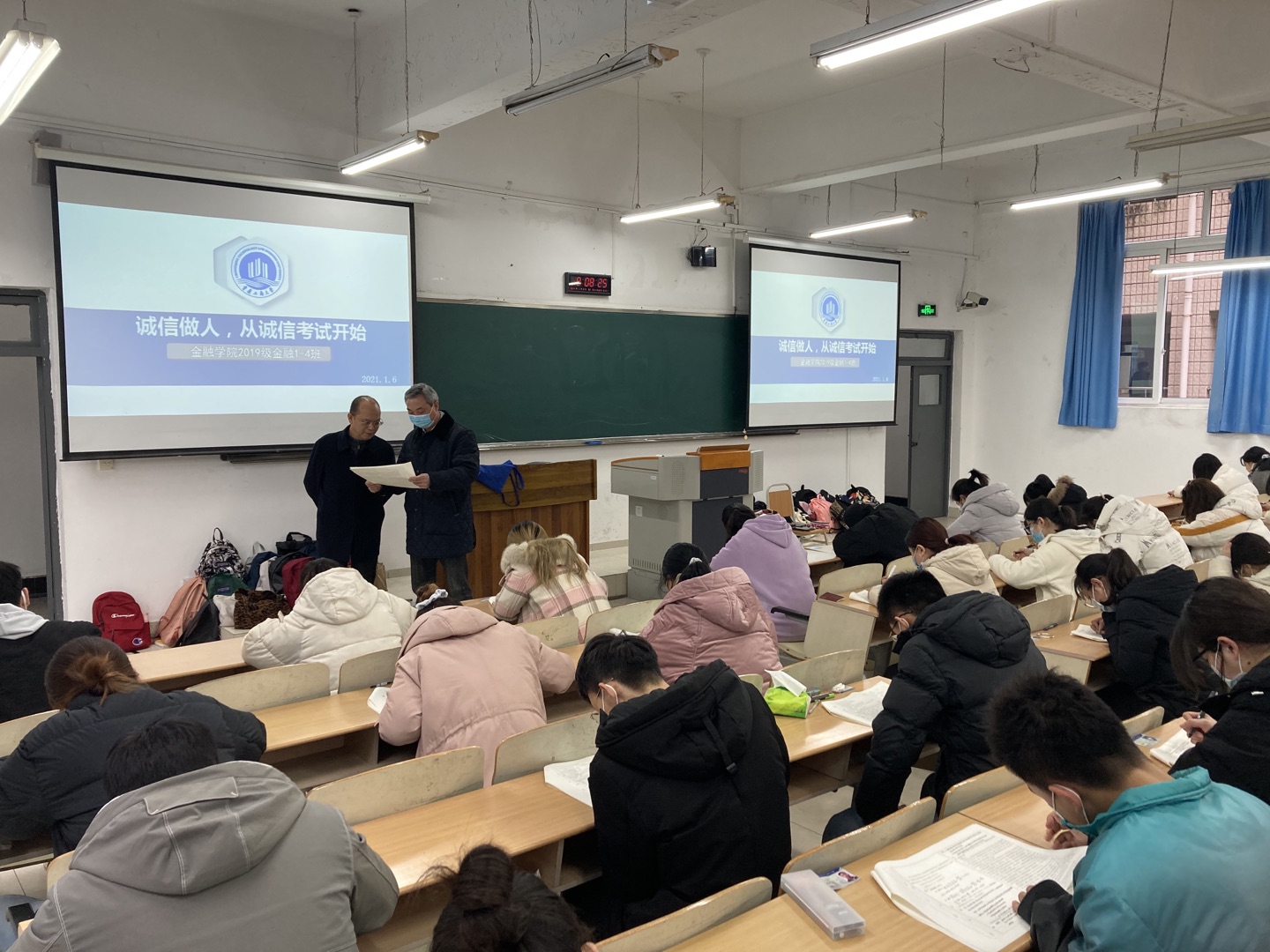 为培养具有“新儒商”精神的新时代大学生,践行“诚信做人,从诚信考试开始”的誓言,2021年1月6日KY开元集团官网2019级金融学专业共计159名学生自愿申请在博智楼07207和07208教室举行《金融学》课程的“免监考”诚信考试,这是KY开元集团官网首次举行的“免监考”诚信考试,副校长李国军教授、校长助理谭松涛教授前来巡考。
