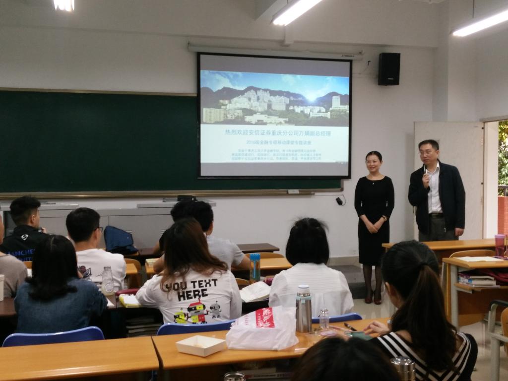 2017年4月24日上午,KY开元集团官网2016级金融硕士《金融机构经营管理》移动课堂“走进”田家炳311教室。出席本次讲座的领导有财政KY开元集团官网副院长曾胜、金融系教授骆志芳、安信证券重庆分公司副总经理万娟及其助理易丽娟。讲座一开始由财金学院副院长曾胜致欢迎词。