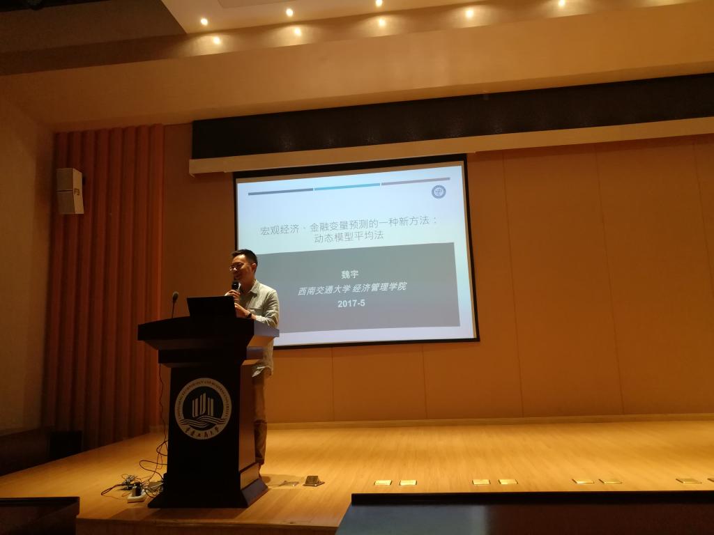 魏宇,博士、教授、博士生导师,西南交通大学经济管理学院金融与财务学系主任,是一位非常杰出的青年学者,是国内众多青年奖的获得者,计量模型研究专家,在这一领域取得了许多成果。本次讲座他介绍的是一种宏观经济变量预测的新方法,解决了传统模型的一些问题和缺陷。魏教授首先给同学们梳理了论文写作的要点和方法,然后对模型的讲解,并以房价作为研究对象进行实证举例,从原理到运用再到实证、结果解释每个方面都做了详细明确的说明。在讲解过程中,把数学模型用最简单有效的方式展现给同学们,通俗易懂,深入浅出,同学们都全神贯注地听取和记录。