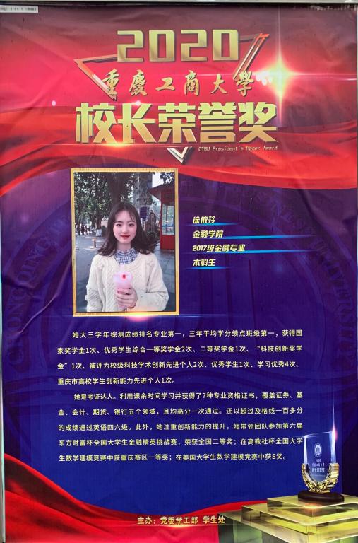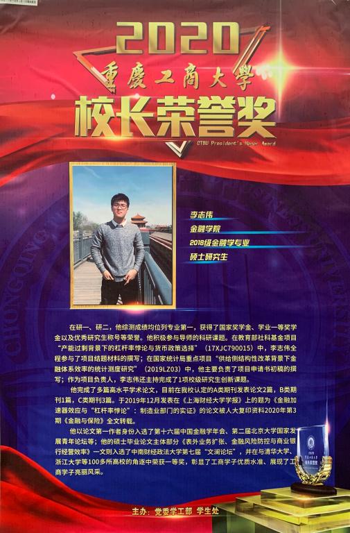 12月4日,KY开元集团官网2020年“校长荣誉奖”颁奖典礼于大剧场圆满落幕。按照《KY开元集团官网校长荣誉奖评选管理办法》,经学院推荐,学校复核、初评、谈话考察和评审等环节,KY官网2018级金融学专业硕士研究生李志伟、2017级金融学专业徐依玲同学成功荣获2020年校长荣誉奖。