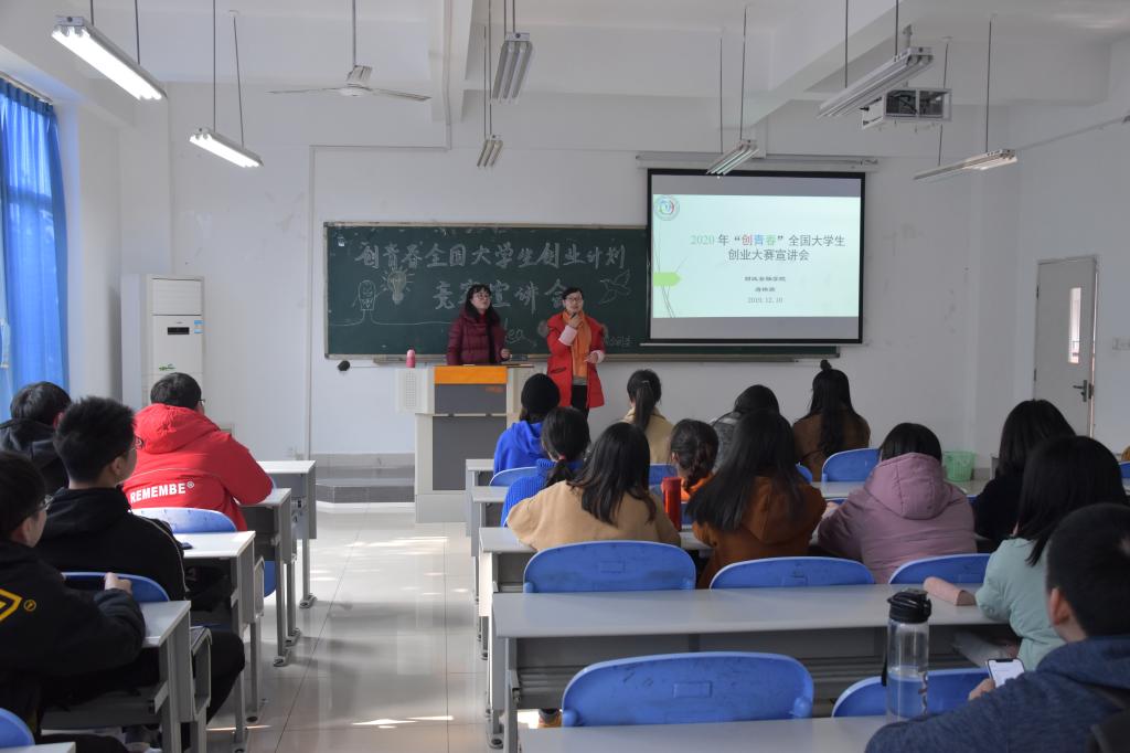 蒋老师就创业大赛的几个关键事项和同学们做了交流,内容分别是:一、解读“创青春”的内涵;二、对同学们的组队和选题方面进行指导;三、就计划书的撰写提出了基本要求;四、为同学们罗列了一些参赛的注意事项。蒋老师向同学们介绍了“创青春”的发展历程,并对参赛队伍的成员提了建议,她指出:“参赛人员的构成要达到知识结构和个人能力特色的多样化,要利用好现有的数字化资源,广泛的查阅书籍和文献,以实现作品的高质量效果。”讲解结束后,蒋老师与兰老师还和同学们开展了进一步的探讨,很多同学就本次竞赛提出了自己的疑惑,蒋老师和兰老师分别一一做出解答。会议最后,蒋老师表示看到同学们积极踊跃的参赛很欣慰,希望同学能坚持下去,并鼓励大家都能够多关注像“创青春“这样专业性强、有实践意义的比赛,通过不断的实践提升自身的创新创业能力。