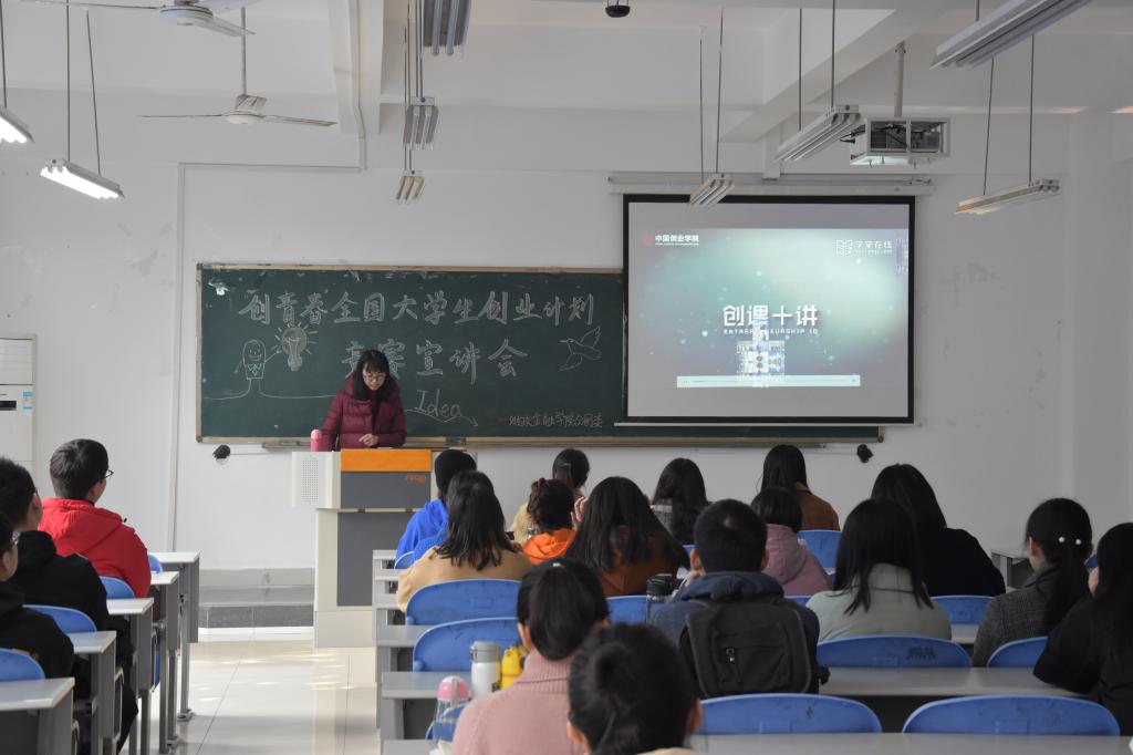 12月10日,KY开元集团官网财政KY开元集团官网于南岸校区田家炳306成功举办“创青春”全国大学生创业大赛宣讲会。主讲人是财政KY开元集团官网学科竞赛分管老师蒋伟燕老师,财政KY开元集团官网分团委副书记兰丽娟老师也出席了本次会议。